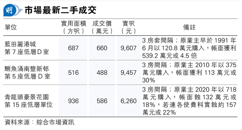 據了解,原業主早於1991年6月以120.8萬元一手買入單位,持貨33年,現轉手帳面獲利539.2萬元或逾4.4倍。