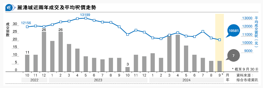 【明報專訊】雖然有減息、股市上升等利好因素,惟在一手搶客的情况下,二手市場交投及售價仍然平淡,惟睇樓氣氛已明顯好轉。藍田麗港城9月錄得7宗成交,與8月全月交投量看齊,惟平均實用呎價未能跟上,9月份進一步下調至10,581元,按月跌幅2%。區內代理表示,市場氣氛回升,過去一周的睇樓量有約兩至三成的增幅,而準買家亦積極還價。